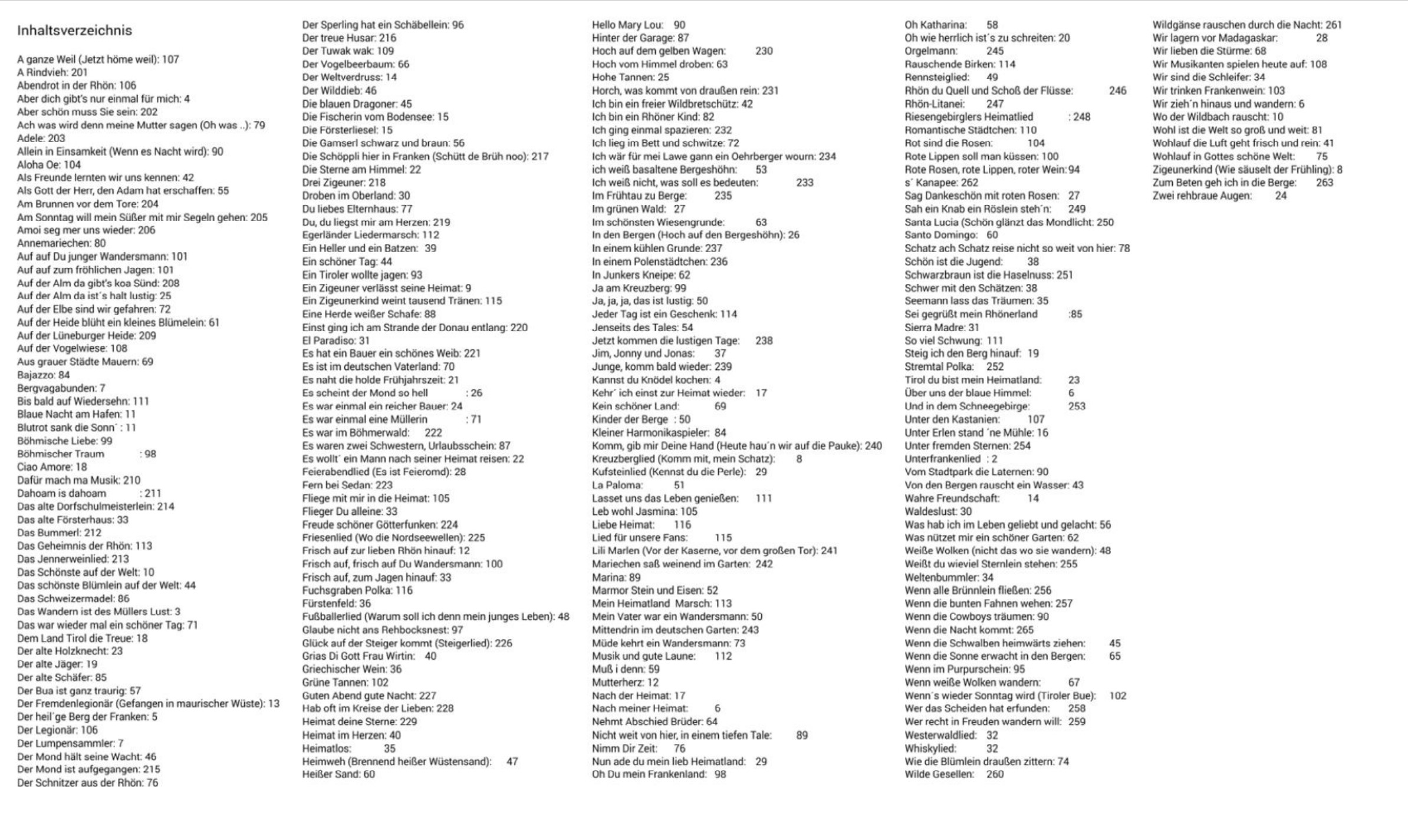 - großes Liederbuch (nur als Download hier als PDF Datei), zusätzlich auch moderne Lieder, Schlager, über 400 Seiten